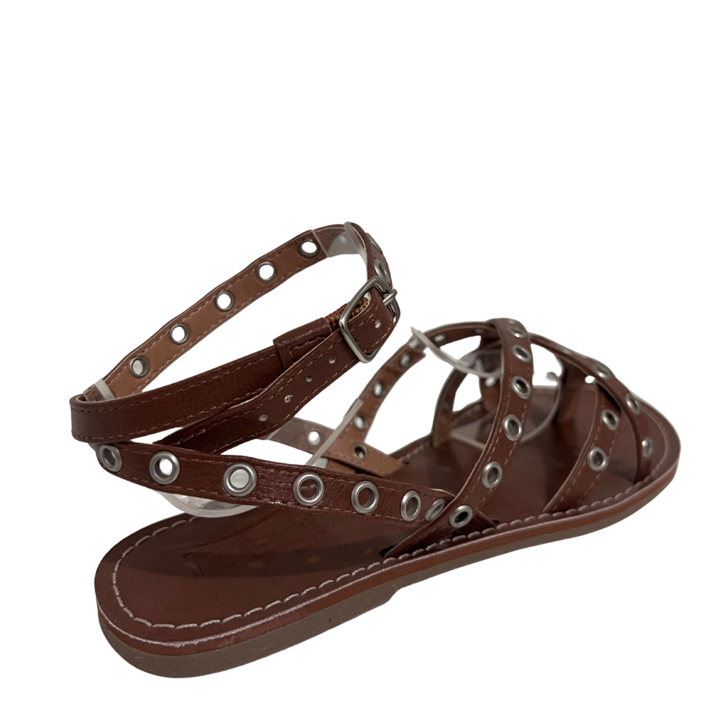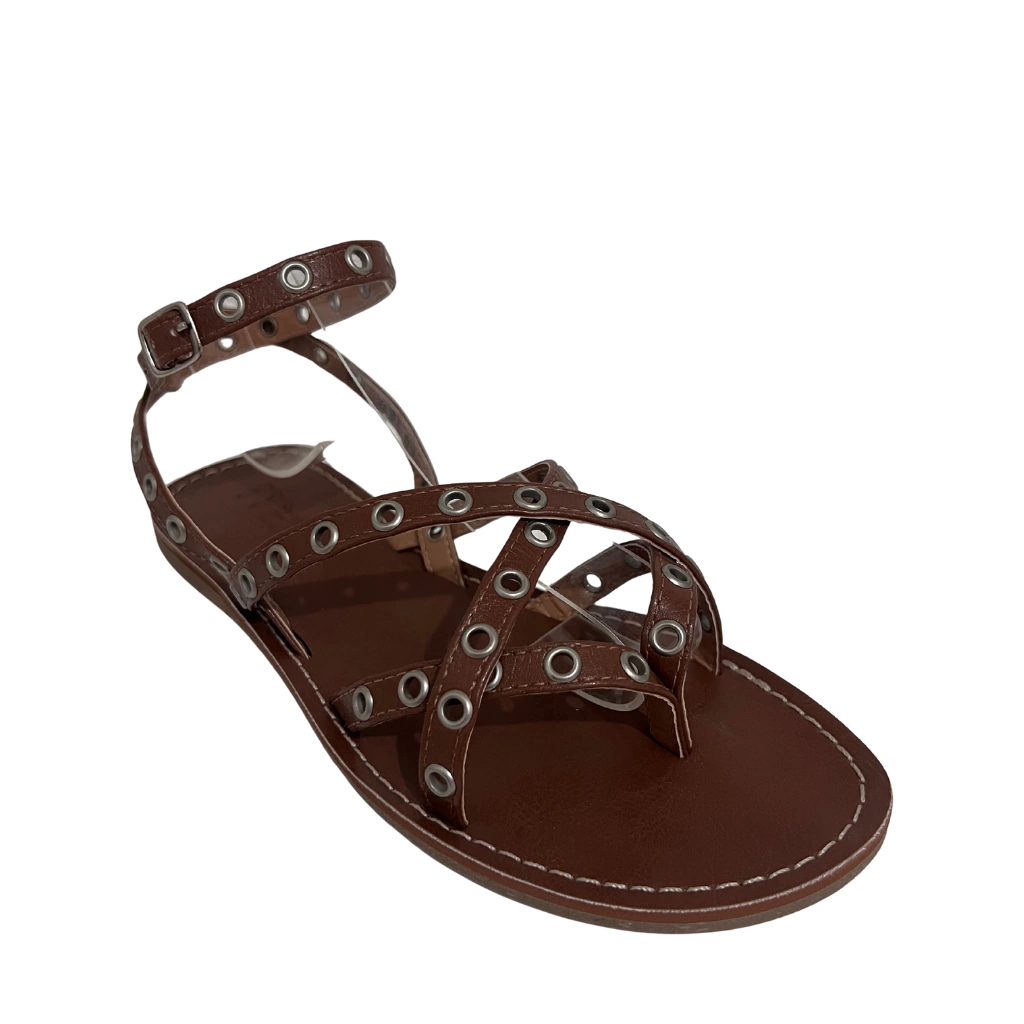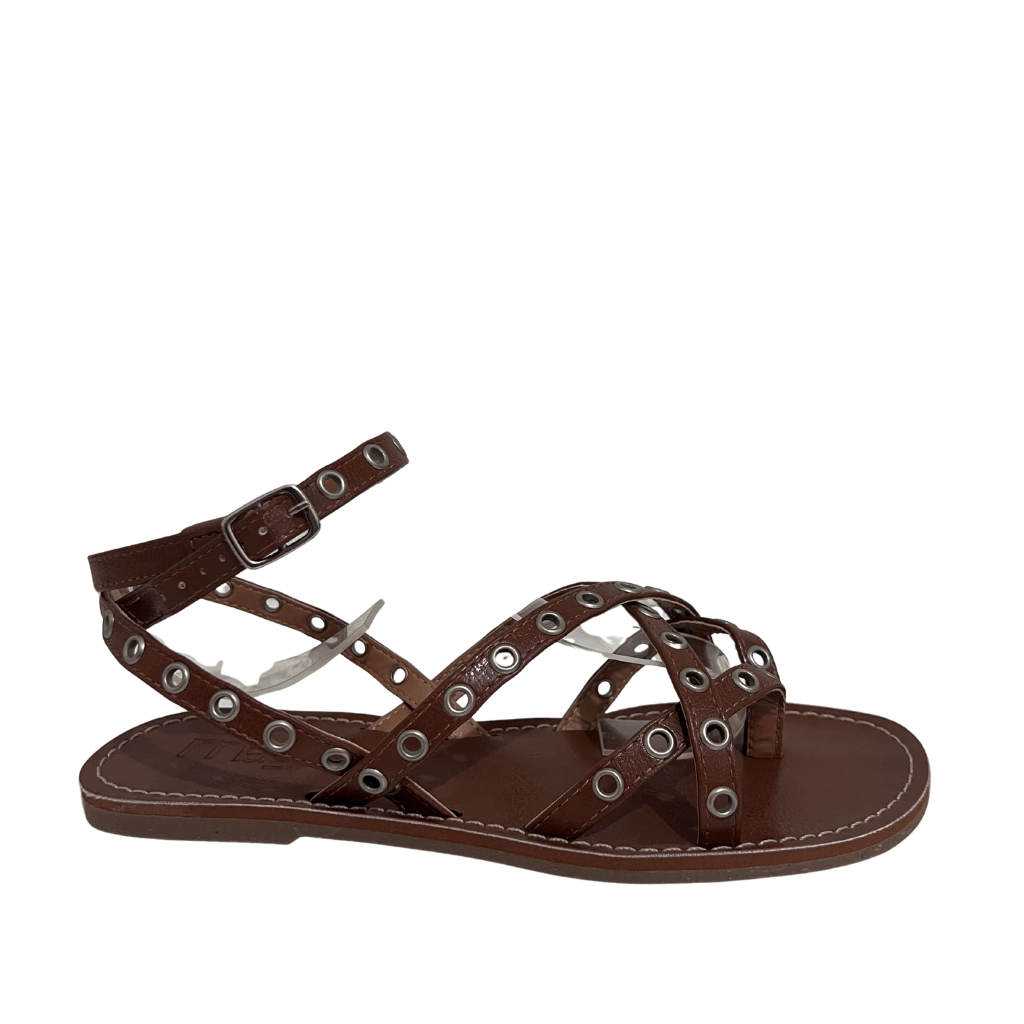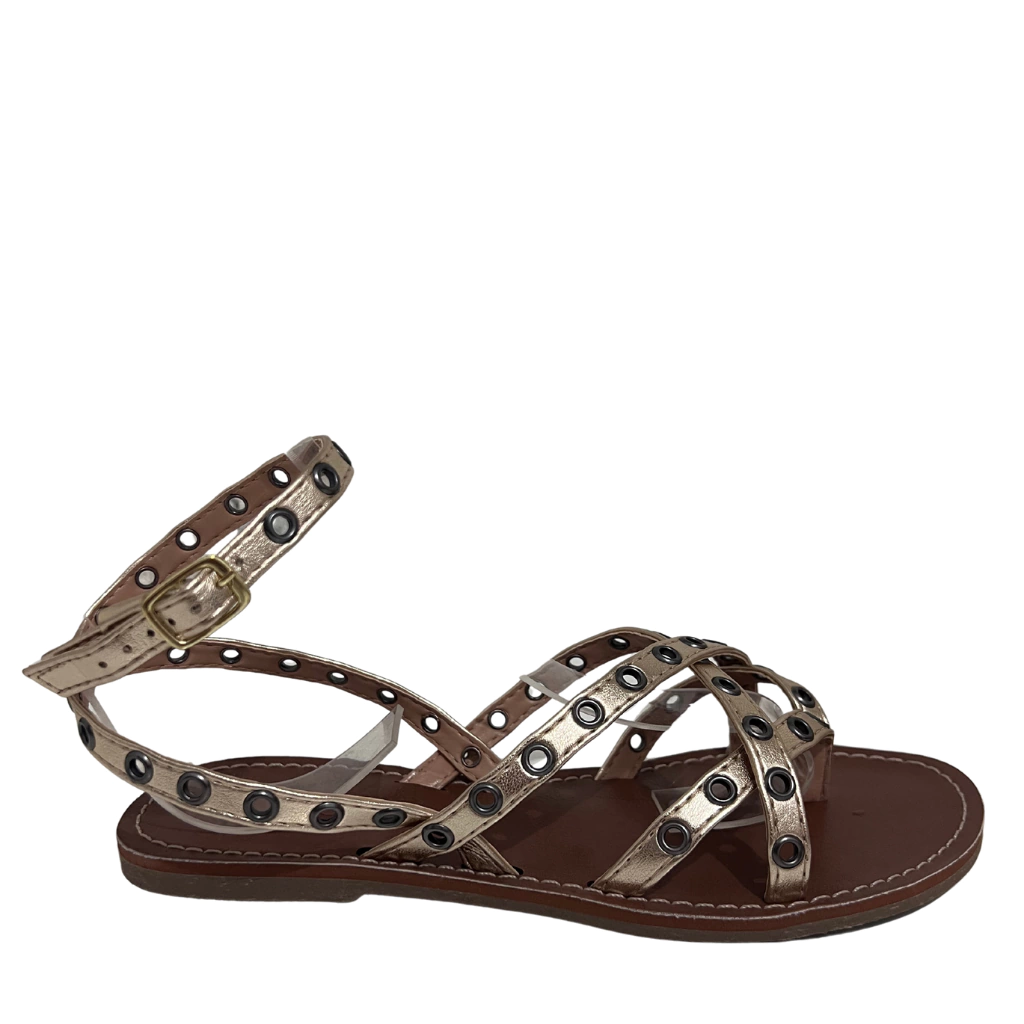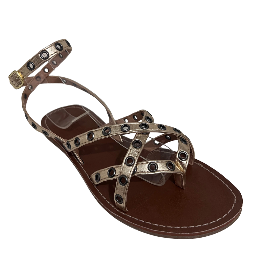 Charmosa e cheia de estilo, essa rasteira é o equilíbrio perfeito entre conforto e personalidade. O modelo conta com tiras cruzadas com detalhes em ilhós metalizados, que trazem um toque moderno e fashion ao visual.