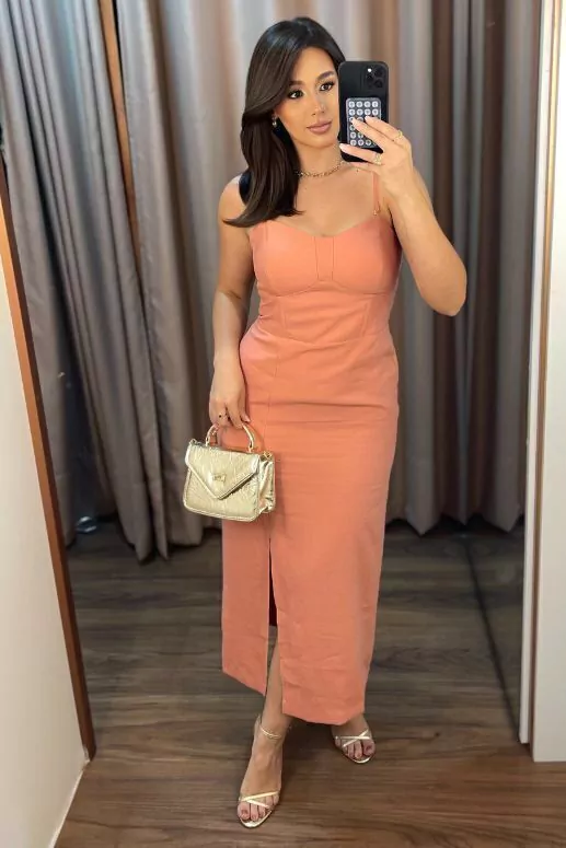O vestido feminino Pura Mania midi com busto estruturado e fenda é uma peça elegante e sofisticada, ideal para eventos formais ou ocasiões especiais. O busto estruturado proporciona suporte e modela a silhueta, enquanto o comprimento midi oferece um visual clássico e ao mesmo tempo moderno. A fenda na saia adiciona um toque de sensualidade e movimento, criando um contraste interessante com a sofisticação do vestido. Perfeito para quem busca um look equilibrado entre elegância e ousadia.